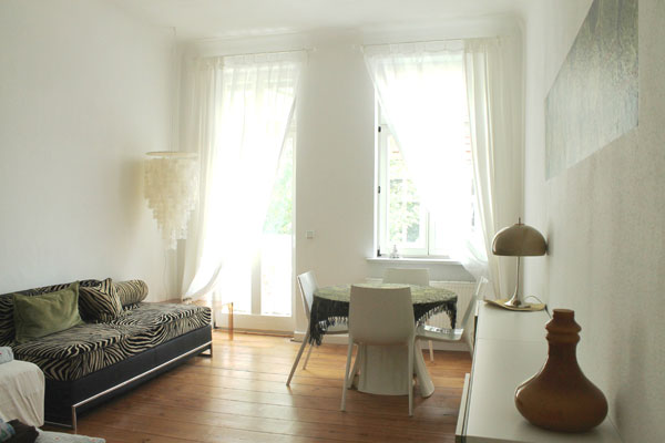 Fully furnished, cozy 1-room Apartment. Wooden floors, balcony, bathroom with tub, wifi, TV, DVD, washing machine, in quiet garden house. For prices and booking dates please ask by mail or call.