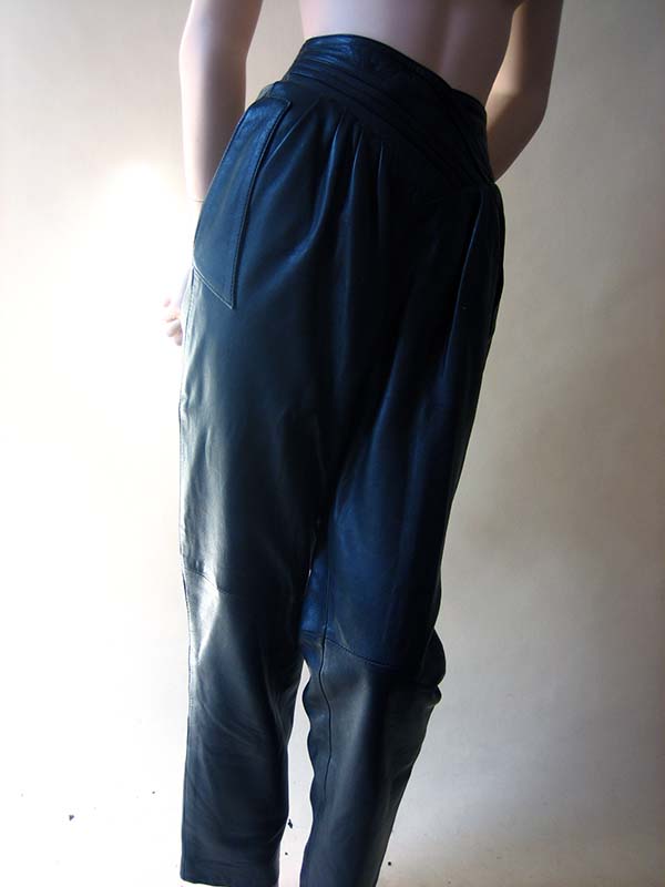Black 80s leather pants, wide-waisted carrot cut and side pockets